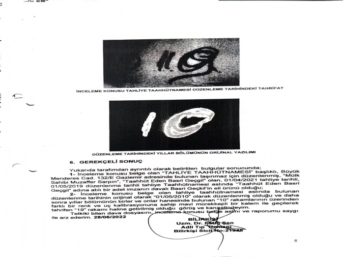 Mülk sahibinin yaptığı tahrifatı tespit etme sürecini anlatan kiracı B.G.’nin avukatı Şenay Geçkil, "Müvekkilimiz, mülk sahibinin kendisine tahliye taahhütnamesine dayalı tahliye emri göndermesi nedeniyle tarafımıza başvuru yaptı. Taahhütname üzerinde yaptığımız teknik incelemede, 2010 olan düzenlenme tarihinin mülk sahibince 2019 olarak değiştirdiğini tespit ettik. Akabinde derhal itirazda bulunduk ve tahliye işlemlerini durdurduk. Mülk sahibi bu kez tahliye istemli olarak Sulh Hukuk Mahkemesine dava açtı. Dava aşamasında yapılan bilirkişi incelemesinde belge üzerinde tahrifat yapıldığı ortaya çıktı. Rapor sonucunda yerel mahkeme tahrif edilen kısımda; ayrıca kiracının imzası bulunmaması nedeniyle taahhütnameyi geçersiz saydı ve mülk sahibinin açtığı tahliye davasını reddetti. Müvekkilimiz ayrıca mülk sahibi hakkında şikayette bulundu ve İzmir Cumhuriyet Başsavcılığınca mülk sahibi hakkında özel belgede sahtecilik suçu nedeniyle soruşturma başlatıldı.